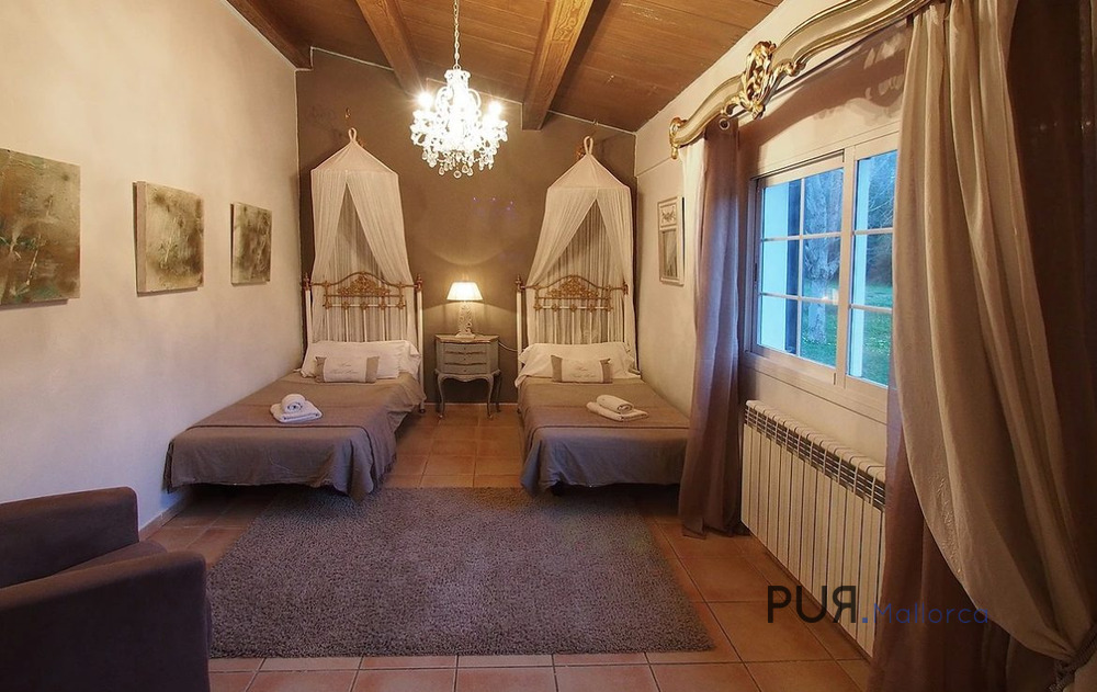 The main house of approximately 320 m² is located in the middle of the park-like grounds and has an open living-dining area with fireplace, an open, fully equipped kitchen, 4 bathrooms and 4 bedrooms, a utility room and a terrace on the 1st floor with magnificent views View of the Tramuntana mountains (World Heritage).