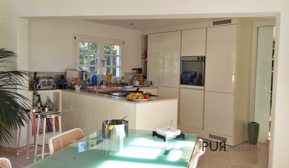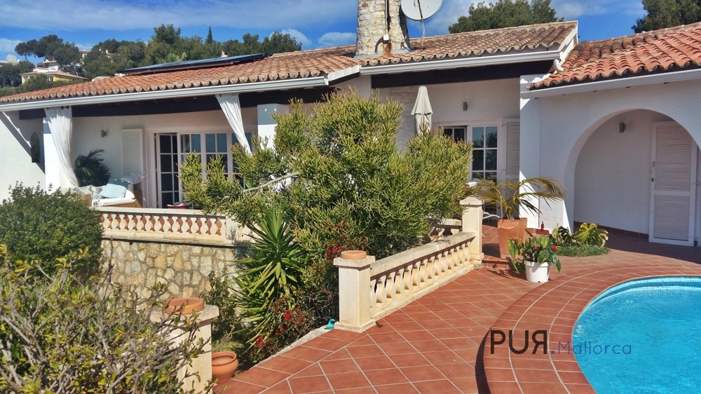 It has four bedrooms, of which one bedroom and a bathroom is separately accessible. A large open plan living room with dining area and modern open kitchen are on one level with access to the partially covered terrace and the pool area with sea views and flat garden.
