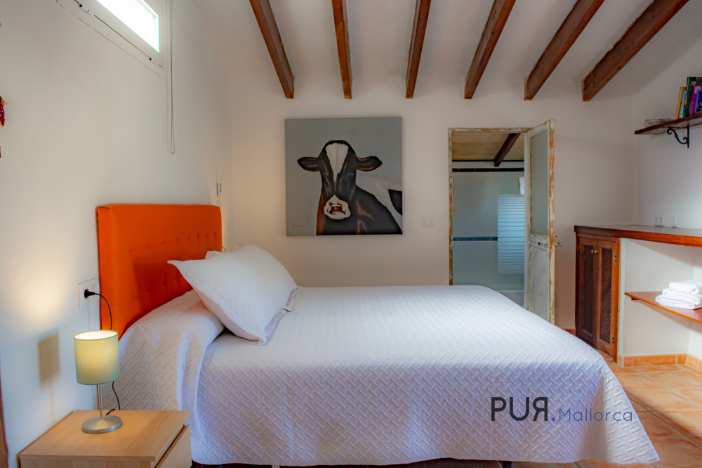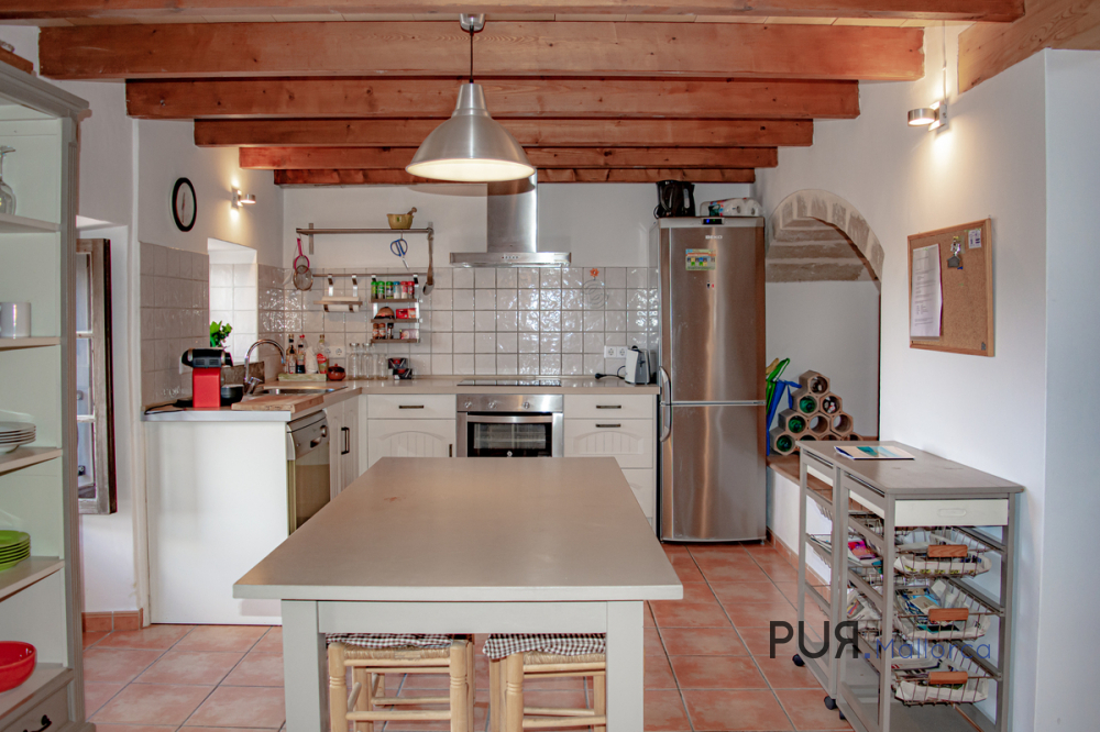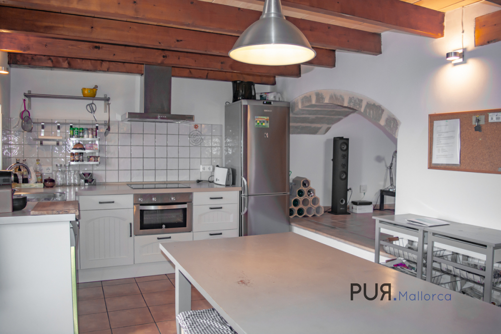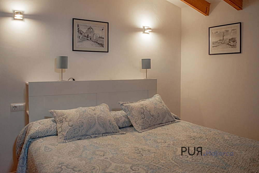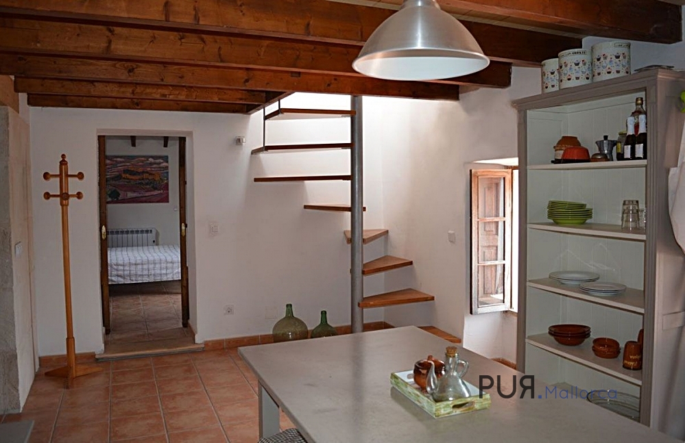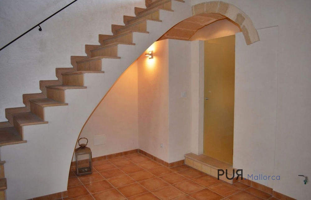 Mediterranean house in Capdepera. The house has a large entrance hall with typical Marès natural stone walls and an arch. There is a shower room under the alcove. There is a kitchen-cum-living room on the upper floor. The living room and a bedroom are on an offset level. The master bedroom is accessible from the kitchen. It has a bathroom en suite with tub. A spiral staircase leads from the kitchen-living room to the roof terrace, from which there is a view over the roofs of the village to the medieval castle of the village.