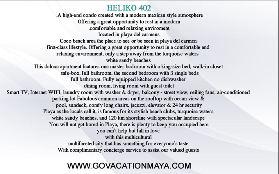 Heliko 402 features One master bedroom with king-size bed, closet, safe-box, full bathroom, double bedroom with 3 single-size beds, closet, full bathroom, fully equipped kitchen(no dishwasher), living room with cable TV, Internet WIFI, guest toilet, laundry area with washer/dryer, ceiling fans, air-conditioned, balcony street view.Great common areas like the sun deck, elevator, pool, gated parking lot.