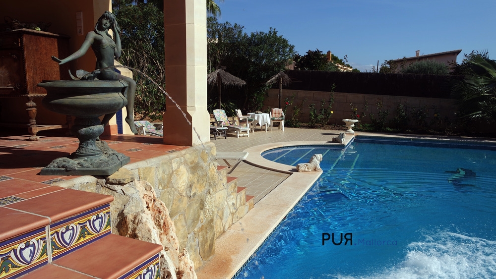 This very well maintained two-storey villa in Mediterranean architecture and of German construction quality is located on a very well landscaped garden in the picturesque bay of Cala Pi on the south coast of the island. The south-facing property offers a spacious living room and a cozy dining area with American kitchen three bedrooms and three bathrooms (room height 2.80 m). The luxurious house boasts a spacious layout and high-quality interior. Free and covered terraces with integrated swimming pool and barbecue and a beautiful sea and panoramic views from the upper floor complete the offer.